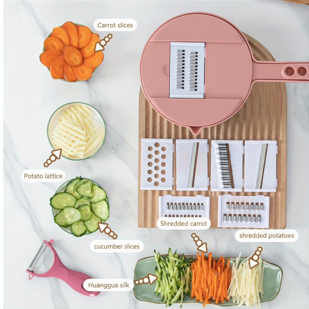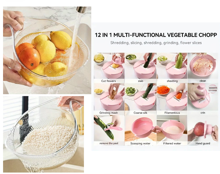 The Multi-Functional Vegetable Chopper makes slicing and dicing effortless — whether it’s onions, carrots, or tomatoes, it’s all done in seconds. Pair it with the Rice Cleaner & Strainer Bowl, perfect for washing and draining rice, fruits, or veggies without the mess.